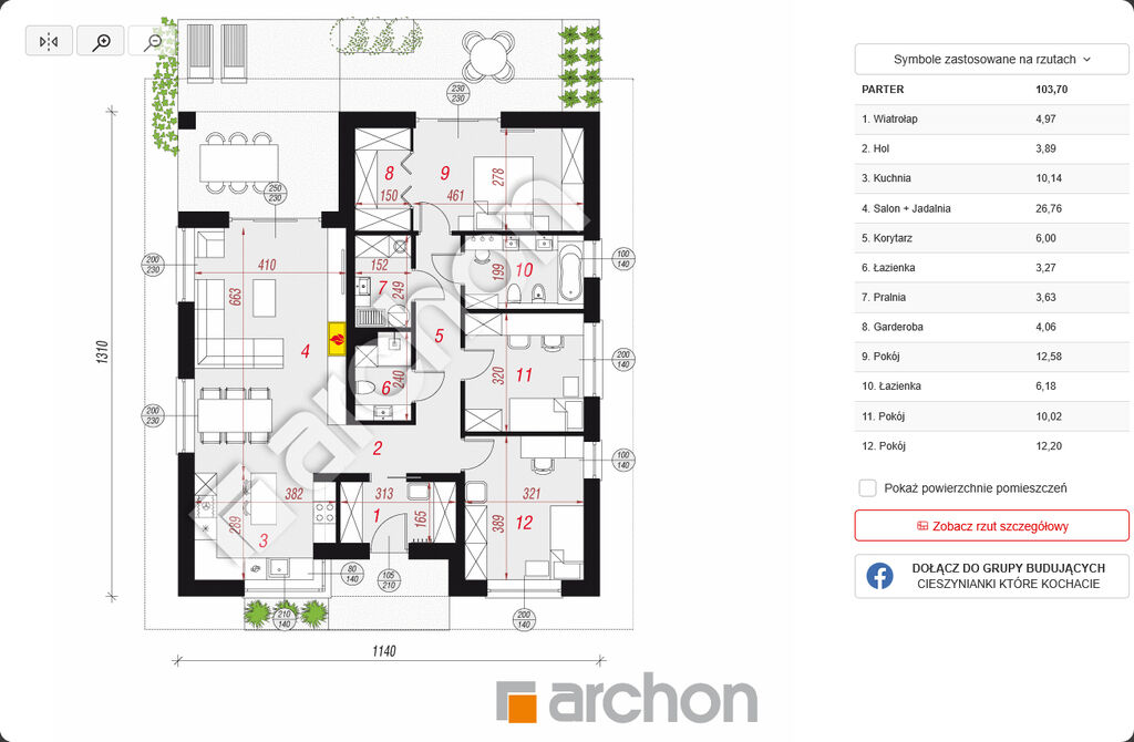 Układ pomieszczeń – 103,70 m² (parter) Wiatrołap – 4,97 m²